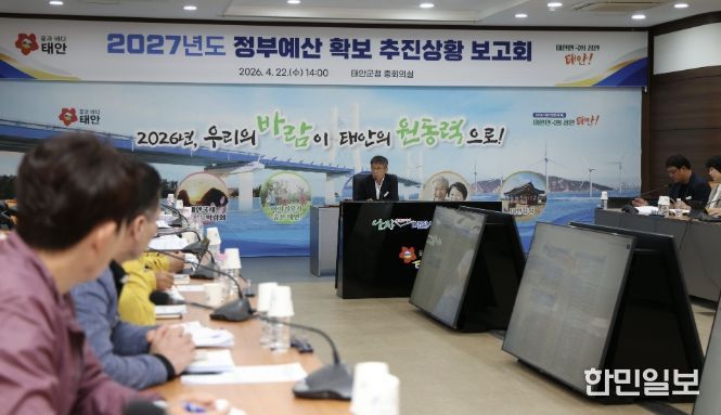 한민일보 서울포커스 임경복 기자 | 태안군이 22일 군청 중회의실에서 이주영 부군수와 각 부서장 등 30여 명이 참석한 가운데 ‘2027년도 정부예산 확보 추진 상황 보고회’를 열고 부처 예산안 반영 현황을 점검하며 세부 대응 전략 논의에 나섰다.