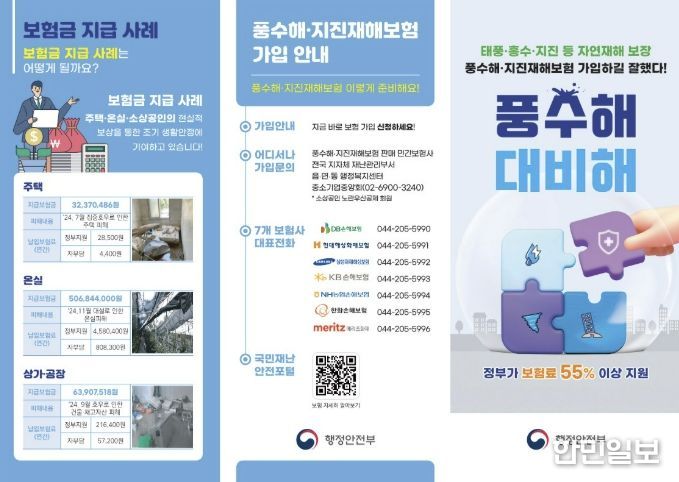 풍수해·지진재해보험은 행정안전부가 관장하고 7개 민영보험사가 운영하는 정책보험으로, 태풍·호우·홍수·강풍·풍랑·대설·지진 등 자연재해로 시설물 피해가 발생할 경우 복구비를 지원받을 수 있다.