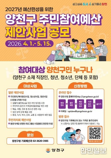 한민일보 서울포커스 곽동근 기자 | 양천구는 2027년 예산 편성 과정에 구민의 목소리를 반영하기 위해 ‘주민참여예산 제안사업’ 공모를 오는 5월 15일까지 진행한다고 밝혔다.