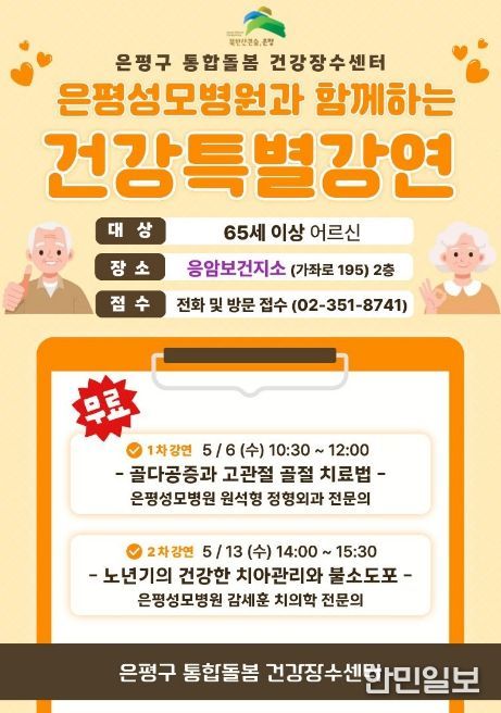 한민일보 서울포커스 임광현 기자 | 서울 은평구는 다음 달 6일과 13일 구민의 건강한 노후생활을 지원하기 위해 65세 이상 어르신을 대상으로 ‘건강특별강연’을 운영한다고 밝혔다.