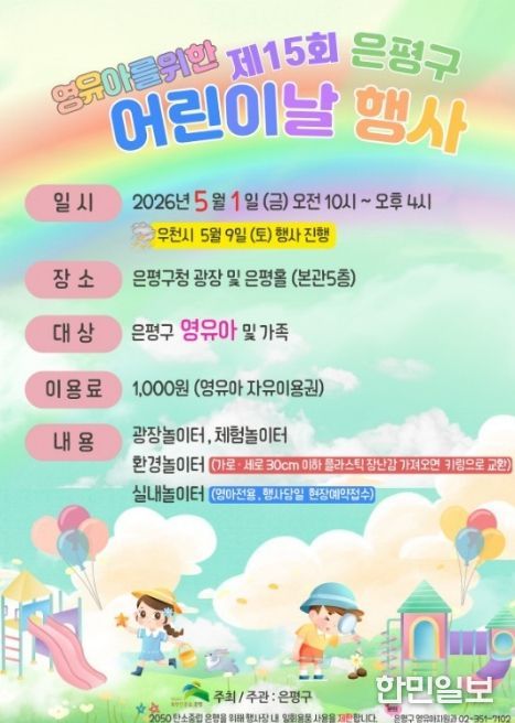 한민일보 서울포커스 임광현 기자 | 서울 은평구는 어린이날을 맞아 내달 1일 은평구청 광장과 은평홀에서 ‘제15회 영유아를 위한 어린이날 행사’를 개최한다고 밝혔다.