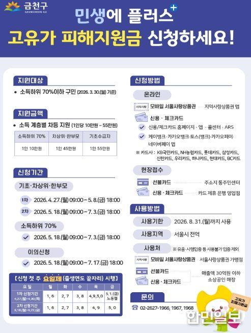 한민일보 서울포커스 곽중희 기자 | 금천구는 중동 정세 불안 등으로 촉발된 고유가·고환율·고물가 상황에서 구민의 생활 부담을 완화하고 지역경제를 활성화하기 위해 오는 27일부터 ‘1차 고유가 피해지원금’ 신청 접수 및 지급을 시작한다고 밝혔다.