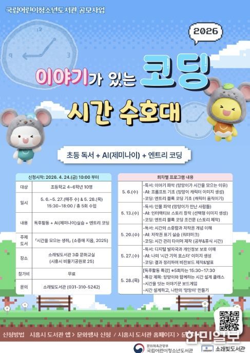 한민일보 서울포커스 유현민 기자 | 시흥시 소래빛도서관은 국립어린이청소년도서관이 주최하는 ‘2026년 이야기가 있는 코딩’ 공모사업 운영기관으로 선정돼 오는 5월 6일부터 어린이 대상 독서·디지털 융합 프로그램을 운영한다.