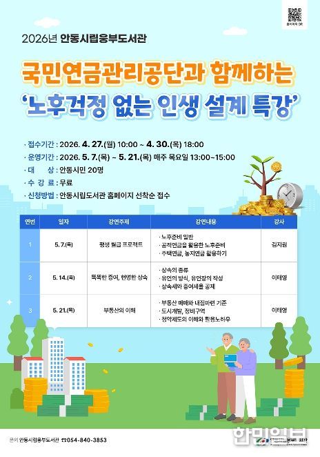한민일보 서울포커스 김봉순 기자 | 안동시립웅부도서관은 지역 주민들에게 건강하고 안정적인 노후생활을 지원하기 위해 부동산, 연금, 상속 등 행복한 노후 설계의 핵심 노하우를 전하는 ‘노후 걱정 없는 인생 설계’ 특강을 운영한다고 23일 밝혔다.