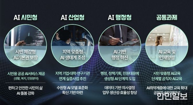 ‘시민 모두의 인공지능 기본권 실현’, ‘인공지능 산업생태계 조성’, ‘인공지능 기반 행정 혁신’을 3대 목표로 설정하고, ▲인공지능(AI) 시민청 ▲인공지능(AI) 산업청 ▲인공지능(AI) 행정청 ▲인공지능 교육·인재 양성으로 분야를 나눠 인공지능 기반 사업을 추진한다.