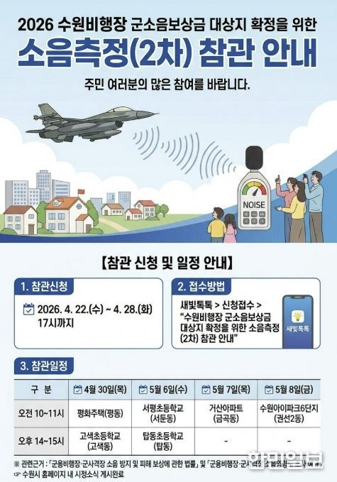 한민일보 서울포커스 진광성 기자 | 수원특례시가 수원비행장 인근 주민들의 소음 피해 보상 근거가 될 국방부의 ‘수원비행장 소음 영향도 조사 2차 소음측정’ 주민 참관 참여자를 모집한다. 4월 28일까지 새빛톡톡으로 신청할 수 있다.
