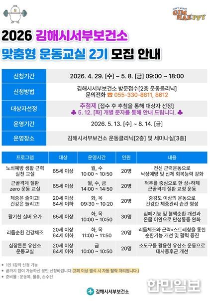 한민일보 서울포커스 김은금 기자 | 김해시서부보건소에서 오는 29일부터 5월 8일까지 『2026년 맞춤형 운동교실 2기』 신규 참여자를 모집한다.