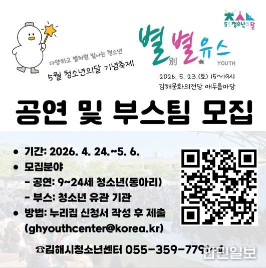 한민일보 서울포커스 김은금 기자 | 김해시청소년센터는 청소년이 직접 기획하고 참여하는 2026년 청소년의 달 기념 축제 ‘별별유스’를 앞두고 공연 및 체험 부스 참가팀 모집에 나섰다고 밝혔다.