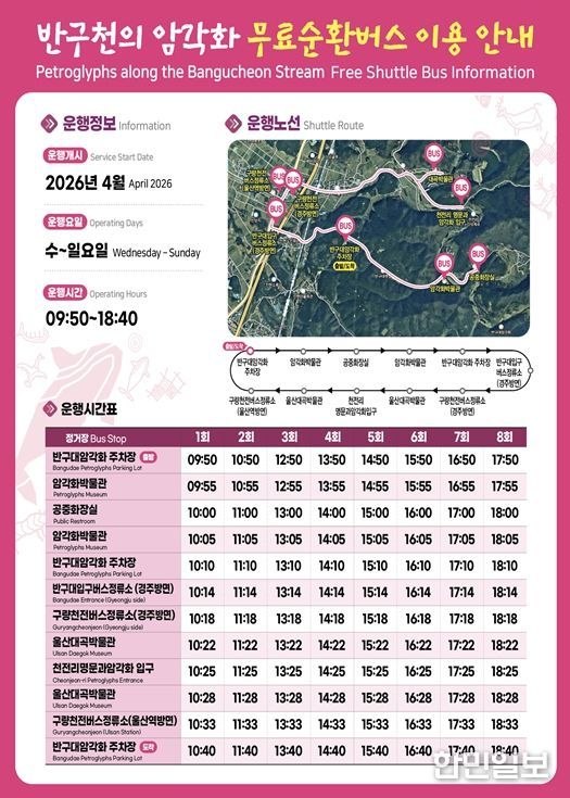 운행 시간표는 암각화박물관 등 주요 거점 안내 표지판과 울산시 공식 누리소통망(SNS)을 통해 확인할 수 있다.