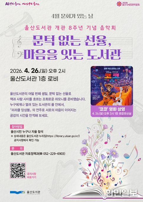 한민일보 서울포커스 임경복 기자 | 울산도서관은 오는 4월 26일 오후 2시 도서관 1층 로비에서 개관 8주년을 맞아 4월 문화가 있는 날의 일환으로 ‘문턱 없는 선율, 마음을 잇는 도서관’ 음악회를 개최한다고 밝혔다.