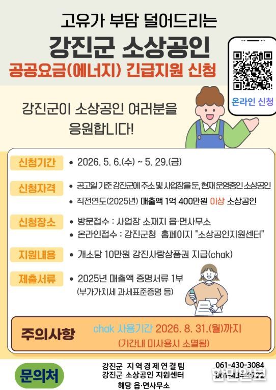 지원 대상은 공고일 기준 강진군 내에서 대표자 주민등록 주소 및 사업장을 운영 중인 소상공인으로, 직전 연도(2025년) 매출액이 1억 4백만 원 이상인 업체다.