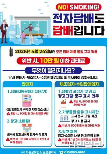 한민일보 서울포커스 김서윤 기자 | 하동군이 ‘담배사업법’ 개정에 따라 4월 24일부터 5월 15일까지 관내 금연 구역을 대상으로 점검 및 단속을 실시한다.