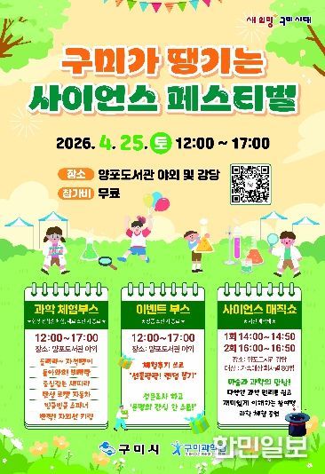 한민일보 서울포커스 김봉순 기자 | 구미과학관은 4월 과학의 달을 맞아 4월 25일 구미어린이과학체험관(양포도서관 내) 일원에서 '구미가 땡기는 사이언스 페스티벌'을 개최한다. 과학을 놀이처럼 즐길 수 있도록 구성한 참여형 행사로, 시민 누구나 부담 없이 참여할 수 있다.