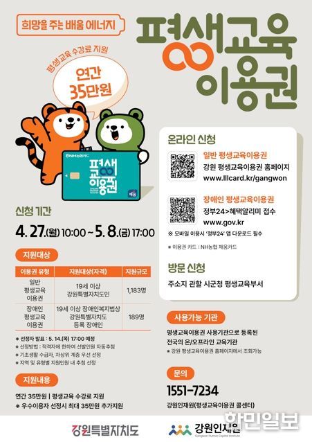 한민일보 서울포커스 진광성 기자 | 홍천군이 경제적 여건에 따른 교육 격차를 줄이고 평생교육 소외계층 성인의 자아실현을 돕기 위해 ‘2026년 강원특별자치도 평생교육이용권 2차 신청’을 4월 27일부터 5월 8일까지 받는다.