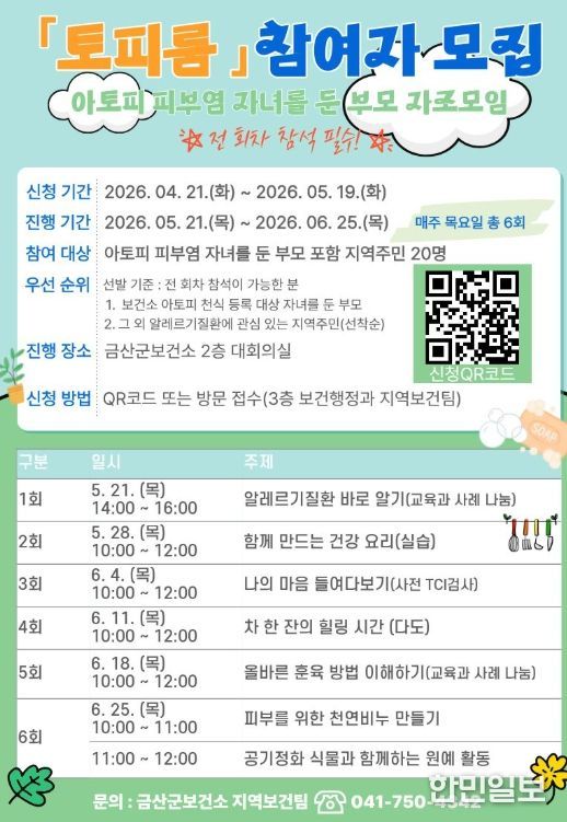 한민일보 서울포커스 유돈상 기자 | 금산군보건소는 아토피 피부염 자녀를 둔 부모의 정서적 지지와 올바른 건강관리 역량 강화를 위해 5월 19일까지 부모 자조모임 ‘토피룸’ 참여자를 모집한다.