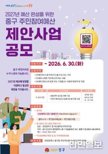 한민일보 서울포커스 김다남 기자 | 인천시 중구는 ‘2027년도 예산편성을 위한 주민참여예산 제안사업 공모’를 추진한다고 23일 밝혔다.
