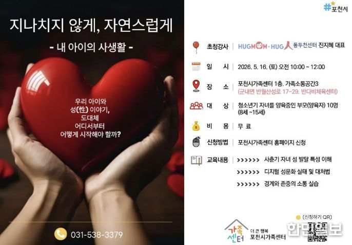 한민일보 서울포커스 심기옥 기자 | 포천시 직영 더 큰 행복 포천시가족센터는 오는 21일부터 사춘기 자녀를 둔 양육자를 대상으로 부모 교육 프로그램 ‘지나치지 않게, 자연스럽게’의 참여자를 모집한다. 이번 교육은 5월 16일 오전, 포천시가족센터 가족소통공간(반다비체육센터 1층)에서 대면 강의로 진행된다.
