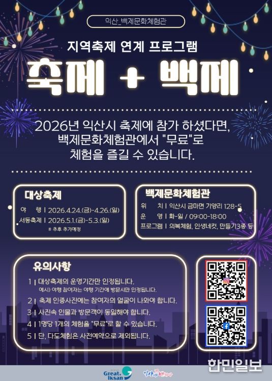 익산시 관계자는 "익산의 대표 축제를 찾은 방문객들이 보다 폭넓게 지역을 즐길 수 있도록 이벤트를 마련했다"며 "앞으로도 다양한 자원을 연계해 체류형 관광 콘텐츠를 지속 확대하겠다"고 말했다.