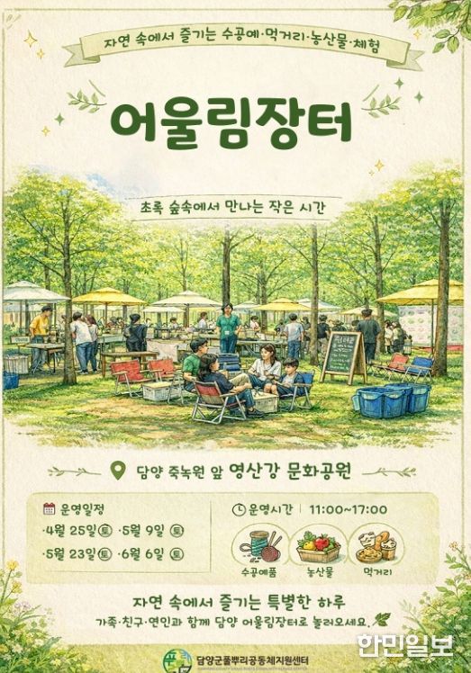 한민일보 서울포커스 임경복 기자 | 담양군 풀뿌리공동체지원센터가 지역 공동체와 소상공인의 상생을 돕고 지역 경제를 살리기 위한 ‘2026년 어울림장터’를 오는 6월까지 총 4회 운영한다.