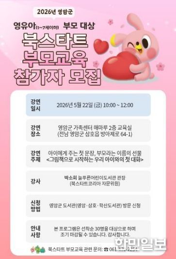 한민일보 서울포커스 임경복 기자 | 영암군이 ‘2026 북스타트 주간’을 맞아 영유아 부모를 위한 부모교육을 운영한다.