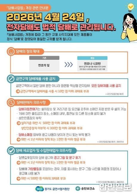 한민일보 서울포커스 황준형 기자 | 평택시는 2026년 4월 24일부터 시행되는 개정 '담배사업법'에 따라 전자담배를 포함한 모든 니코틴 제품이 ‘담배’로 규정되며, 금연구역 내 전자담배 흡연 시 과태료 10만 원이 부과된다고 밝혔다.