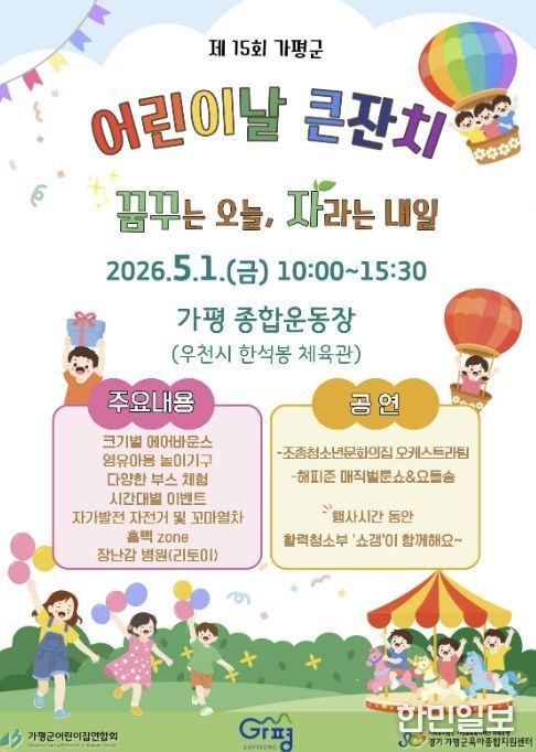 한민일보 서울포커스 최성훈 기자 | 가평군은 오는 5월 1일 오전 10시 가평종합운동장에서 ‘제15회 가평군 어린이날 기념행사’를 개최한다. 가평군어린이집연합회와 가평군육아종합지원센터가 공동 주관하는 이번 축제는 기념행사와 공연, 놀이, 체험 부스 등 다채로운 프로그램으로 꾸며진다.