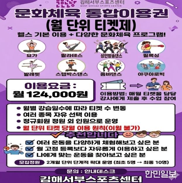 한민일보 서울포커스 김은금 기자 | (재)김해문화관광재단 김해서부스포츠센터는 이용자 중심의 유연한 운동환경 조성과 문화체육 프로그램 활성화를 위해 김해시 공공체육시설 최초로 ‘문화체육 티켓제 통합이용권’ 도입을 추진한다고 밝혔다.