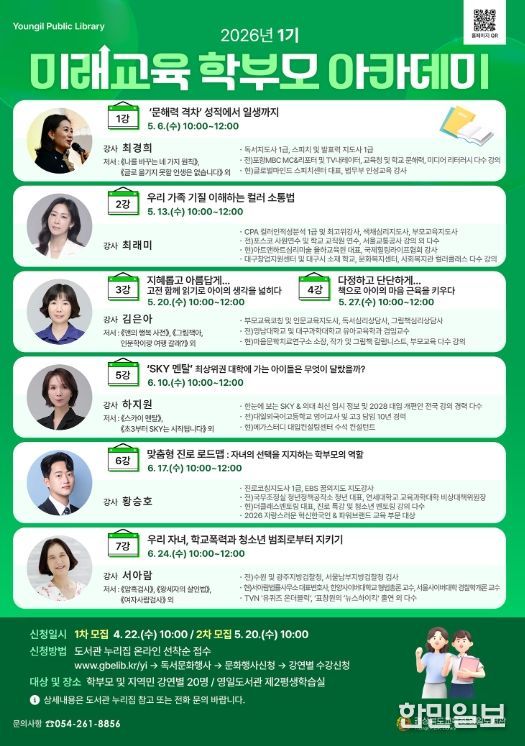한민일보 서울포커스 임경복 기자 | 경상북도교육청 영일도서관은 오는 5월 6일부터 학부모 및 지역주민을 대상으로 ‘2026 1기 미래교육 학부모 아카데미’를 운영하고 수강생을 모집한다.