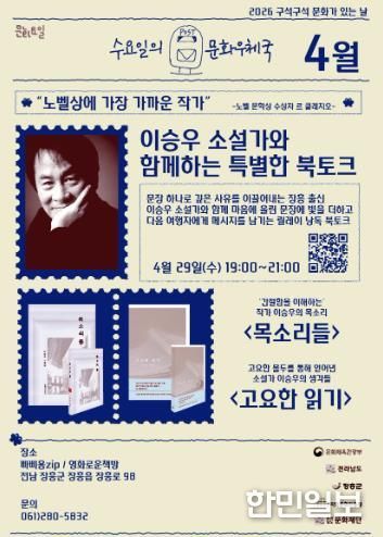 장흥군 관계자는 “이번 북토크는 지역 출신 작가와 군민이 함께 문학을 통해 소통하는 뜻깊은 자리가 될 것”이라며 “문학이 주는 위로와 사유의 즐거움을 느낄 수 있는 시간이 되길 바란다”고 밝혔다.
