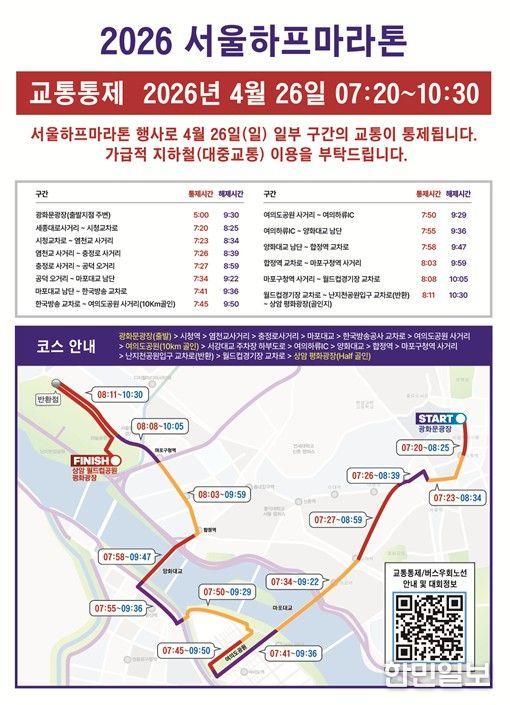 한민일보 서울포커스 최성훈 기자 | 서울시는 4월 26일 오전 7시 30분 광화문광장을 출발해 여의도공원과 상암 월드컵공원으로 이어지는 ‘2026 서울하프마라톤대회’를 개최한다.