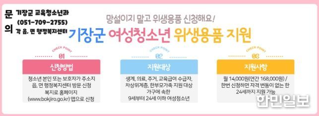 한민일보 서울포커스 임광현 기자 | 기장군은 ‘2026년 여성청소년 위생용품 지원사업’을 본격 추진한다고 23일 밝혔다.