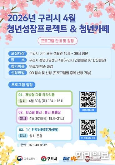 이번 4월 프로그램은 구리시에 거주하거나 생활권을 둔 15세부터 39세까지의 청년을 대상으로 하며, 구리시 청년내일센터 4층에서 진행된다. 참가비는 무료이며 프로그램별 중복 신청이 가능하다. 다만 모집은 선착순으로 마감된다.