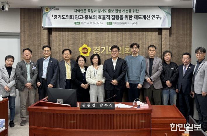 한민일보 서울포커스 진광성 기자 | 경기도의회 의회운영연구회(위원장 양우식)는 지난 22일 의회운영위원회 회의실에서 '경기도의회 광고·홍보의 효율적 집행을 위한 제도개선 연구' 용역 중간보고회를 개최했다.