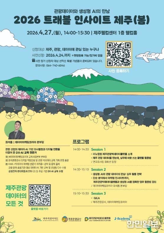 한민일보 서울포커스 임철현 기자 | 제주특별자치도와 제주관광공사(사장 고승철)는 오는 27일 제주웰컴센터에서 관광사업체, 공공기관, 학계 등 관광과 데이터에 관심 있는 분들을 대상으로 데이터 기반 의사결정을 지원하기 위한 ‘2026 트래블 인사이트 제주(봄)’ 세미나를 개최한다고 23일 밝혔다. 이번 세미나에선 새롭게 개편한 제주관광 빅데이터 플랫폼(data.ijto.or.kr)의 활용 방안을 소개하고, 생성형 인공지능(AI)과 관광데이터를 결합한 실무 활용 전략을 공유한다.