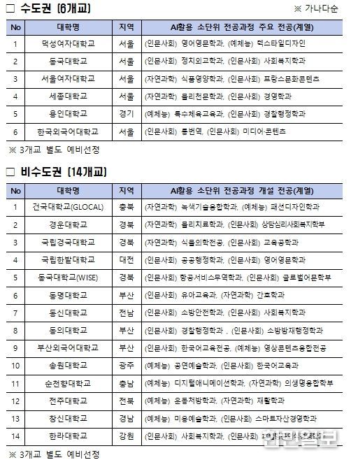 본 사업은 인공지능(AI)이 일상화된 시대에 전공과 관계없이 모든 대학생이 인공지능(AI) 기본 역량을 갖출 수 있도록 대학의 인공지능(AI) 기본교육과정 개발을 지원하는 신규사업이다. 이번 사업은 전공이나 지역 등 여건에 따른 대학 간 인공지능(AI) 교육 격차를 해소하기 위해, 교육부가 별도 지원하는 거점국립대(9개교) 및 과학기술정보통신부가 선정하여 지원 예정인 인공지능 중심대학(10개교)을 제외한 대학 중 20개교를 선정하여 지원한다.