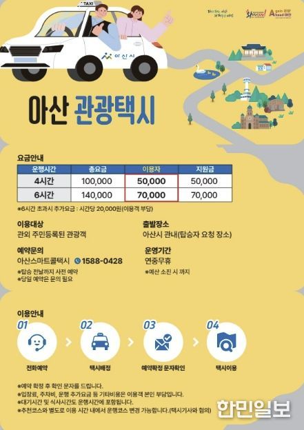 한민일보 서울포커스 임경복 기자 | 아산시는 소규모 관광객의 이동 편의를 높이기 위해 오는 4월 27일부터 ‘아산 관광택시’를 운영한다고 밝혔다.