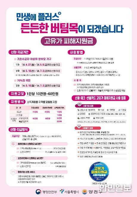 한민일보 서울포커스 곽동근 기자 | 양천구가 중동 전쟁에 따른 고유가·고물가로 어려움을 겪는 구민의 경제적 부담을 완화하기 위해 ‘고유가 피해지원금’ 전담 추진단을 구성하고 27일부터 지급 절차를 시작한다고 밝혔다.