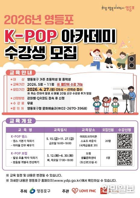 신청 대상은 영등포구에 거주하는 초등·중학생이다. 모집인원은 댄스반 20명, 보컬반 5명이며 수강료는 전액 무료다. 접수는 4월 27일 오전 9시부터 홍보물의 정보무늬(QR코드)를 통해 온라인 선착순으로 진행한다. 구는 매월 20일경 결원이 생기면 추가 모집을 진행해 더 많은 청소년에게 기회를 줄 계획이다. 더 자세한 사항은 문화예술과로 문의하면 된다.