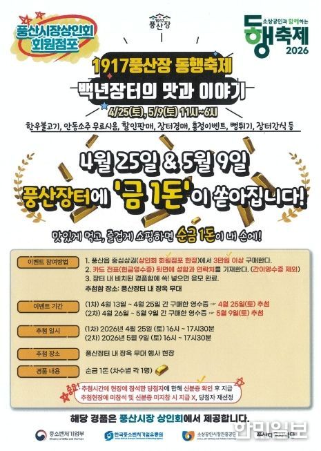 안동시 관계자는 “1917년부터 지역 경제의 중심 역할을 해온 풍산시장의 매력을 널리 알리고자 이번 축제를 기획했다”며, “맛있는 먹거리와 즐거운 쇼핑, 그리고 순금의 행운까지 함께하는 풍산장터에서 백년 장터의 깊은 맛과 이야기를 만끽하시길 바란다”고 전했다.