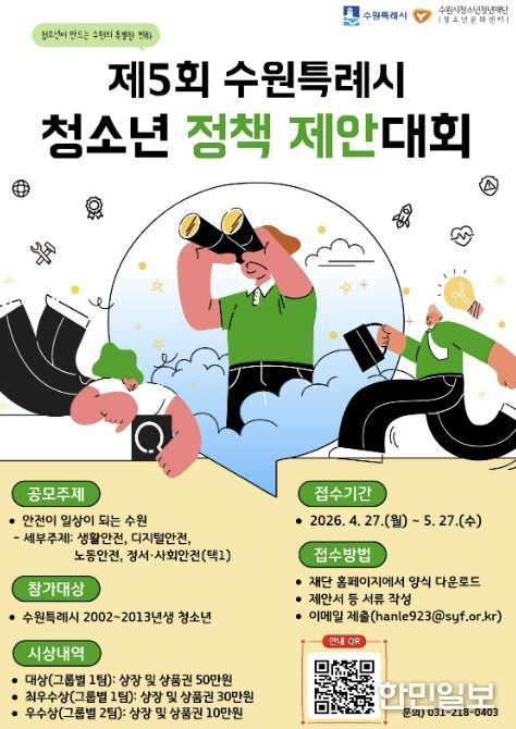 한민일보 서울포커스 진광성 기자 | 수원시청소년청년재단 수원청소년문화센터는 청소년이 정책을 기획하고 제안하는 ‘제5회 수원특례시 청소년 정책 제안대회’ 참가팀을 4월 27일부터 5월 27일까지 모집한다.