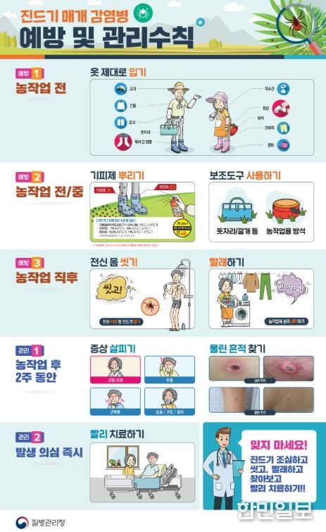 진드기 매개 감염병 예방 수칙으로는 ▲야외 활동 시 긴 소매, 긴 바지, 모자, 장갑, 장화 등을 착용하여 피부 노출 최소화 하기 ▲기피제 사용하기 ▲휴식 시 돗자리 사용하기 ▲ 야외 활동 후 즉시 샤워 및 세탁하기 등이 있다.
