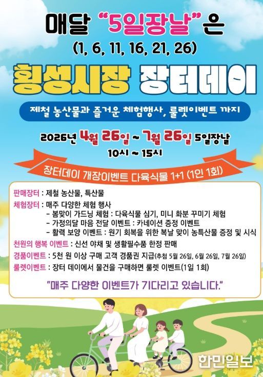 한민일보 서울포커스 진광성 기자 | 횡성군이 전통시장 내 고객 유입을 촉진하고 지역 경제에 활력을 불어넣기 위해 오는 4월 26일부터 7월 26일까지 ‘2026 횡성전통시장 장터데이’ 행사를 개최한다.