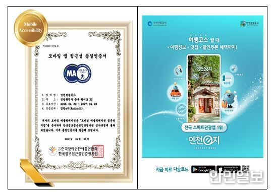 한민일보 서울포커스 유창렬 기자 | 인천광역시(시장 유정복)는 스마트관광 플랫폼 ‘인천e지’ 앱(APP)이 관광약자를 배려한 서비스 구현의 우수성을 인정받아, ‘모바일 앱 접근성 품질인증(Mobile Accessibility)’을 3년 연속 획득했다고 밝혔다.