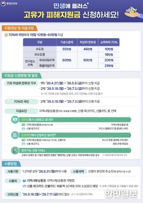 민생안정지원금 2차는 4월 27일부터 5월 22일까지, 고유가 피해지원금 1차는 4월 27일부터 5월 8일까지 각각 신청·접수할 예정이며, 군은 군민들이 신청 기간을 놓치지 않도록 지속적인 홍보와 안내를 이어갈 계획이다.