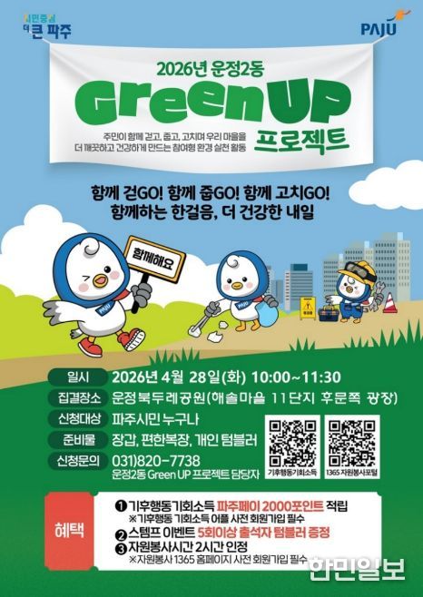 한민일보 서울포커스 진광성 기자 | 파주시 운정2동은 오는 28일 10시부터 운정 북두레공원에서 주민과 함께하는 시민 참여형 환경·건강 프로그램 ‘제3회 그린 업(Green UP) 프로젝트’를 개최한다.