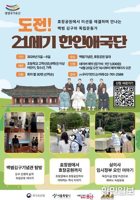 한민일보 서울포커스 김서윤 기자 | 서울 용산구가 내달부터 11월까지 지역 내 국가유산 서울 효창공원(효창원로 177-18) 일대에서 ’효창공원이 생생, 독립운동이 생생‘ 프로그램을 운영한다.