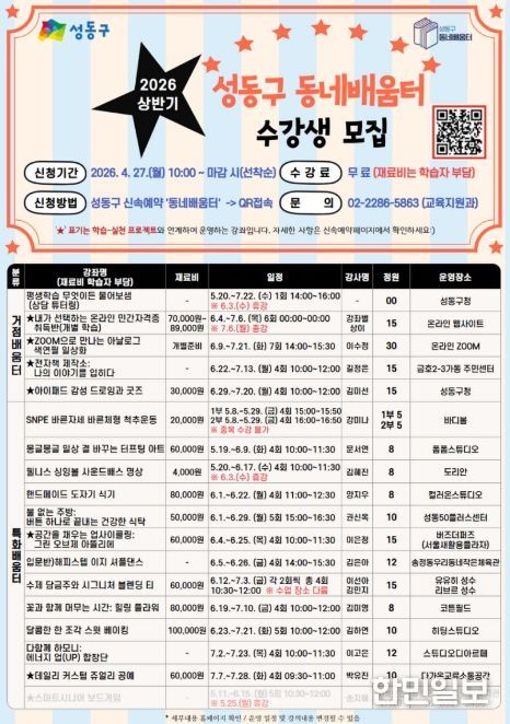 한민일보 서울포커스 임광현 기자 | 서울 성동구가 올해 약 3,800만 원의 예산을 투입해 주민 주도형 평생학습 생태계를 조성하는 ‘2026년 성동구 동네배움터’ 운영에 본격적으로 나선다고 밝혔다.