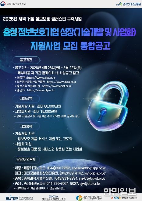 한민일보 서울포커스 김윤이 기자 | 세종테크노파크는 정보보호 유망기업 발굴 및 성장 지원을 위해 ‘정보보호 성장(기술개발 및 사업화) 지원사업’ 충청권 통합공고를 4월 28일부터 진행한다고 밝혔다.