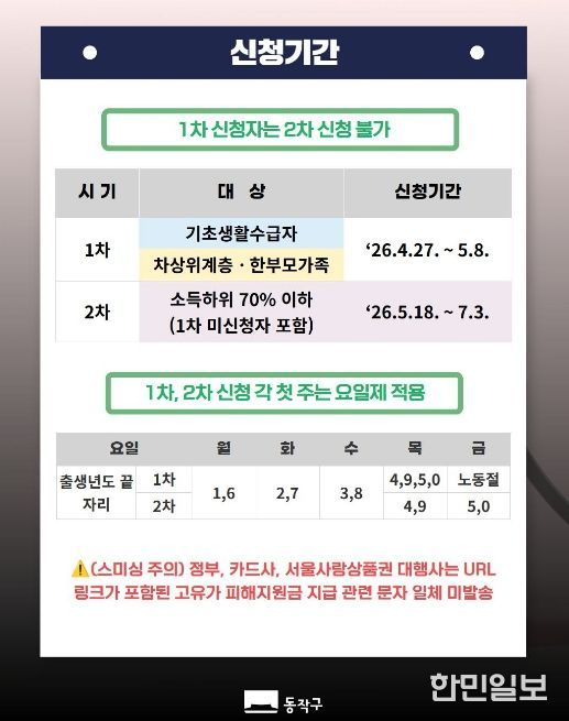 기초생활수급자와 차상위·한부모가정은 4월 27일부터 5월 8일까지 1차, 소득 하위 70% 가구는 5월 18일부터 7월 3일까지 2차 신청이 가능하다.