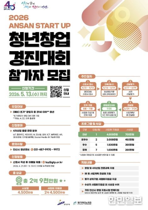 한민일보 서울포커스 임철현 기자 | 안산시는 창의적인 아이디어를 보유한 청년 창업가를 발굴하기 위해 내달 13일까지 ‘2026 안산 스타트업 청년창업 경진대회’ 참가자를 모집한다고 24일 밝혔다.